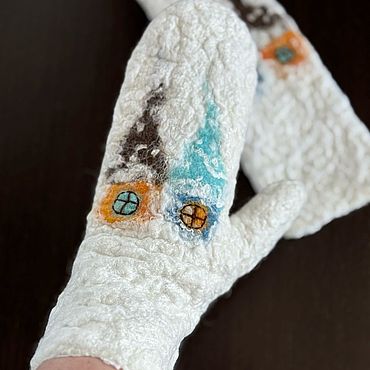 Варежки высокие, немного тянутся в ширину. При заказе указывайте цвет домиков. Отправляю в коробочке с открыткой.