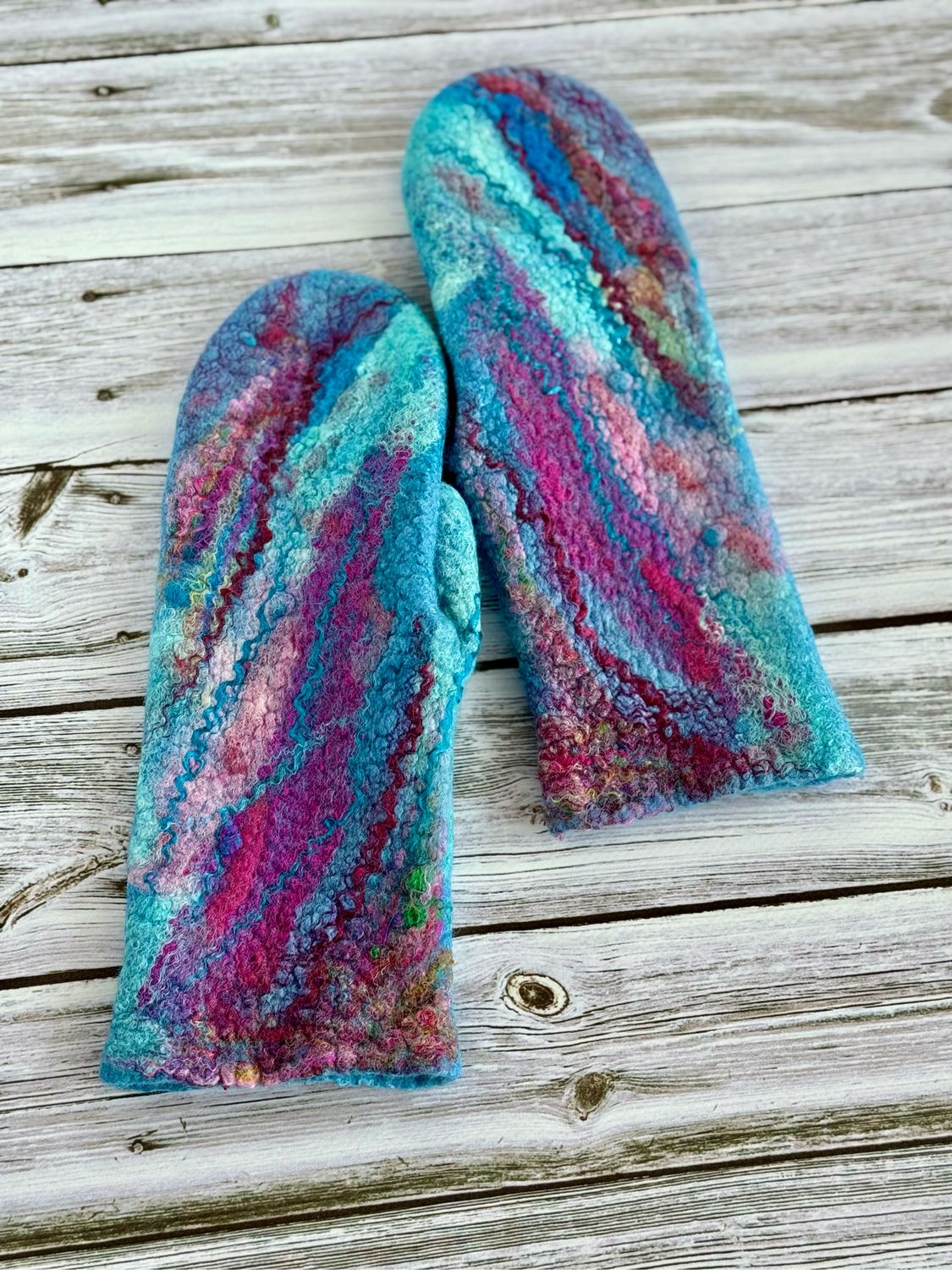 Яркие варежки из шерсти и шёлка. В основе новозеландский мериносовый сливер, декор из шёлковых продуктов: платочки, шёлк сари, малбери; на ладошке (для прочности) вискоза.