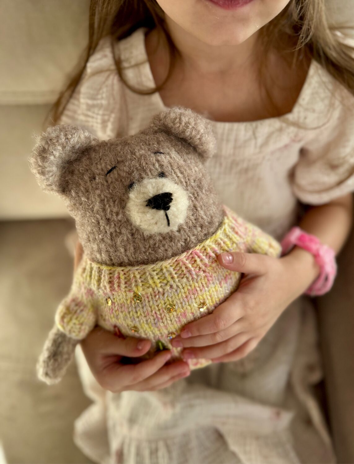 Мишка связан из нежнейшей шерсти с альпакой. Весь мягонький, никаких металлических и пластиковых деталей. Можно играть и обнимать, все детали надёжно пришиты. Набит наполнителем для игрушек.