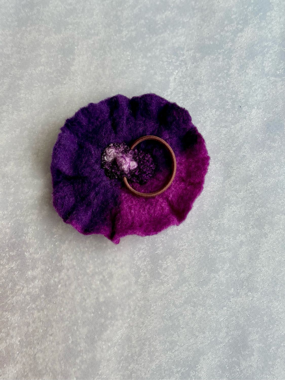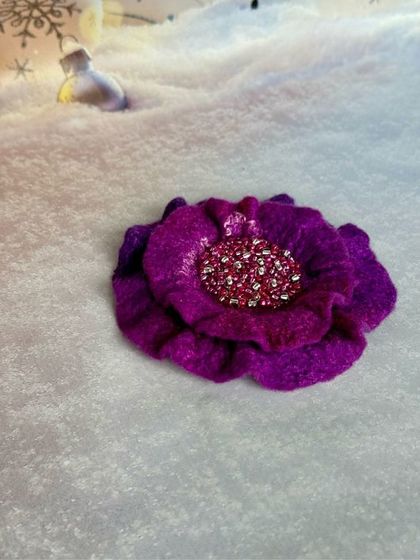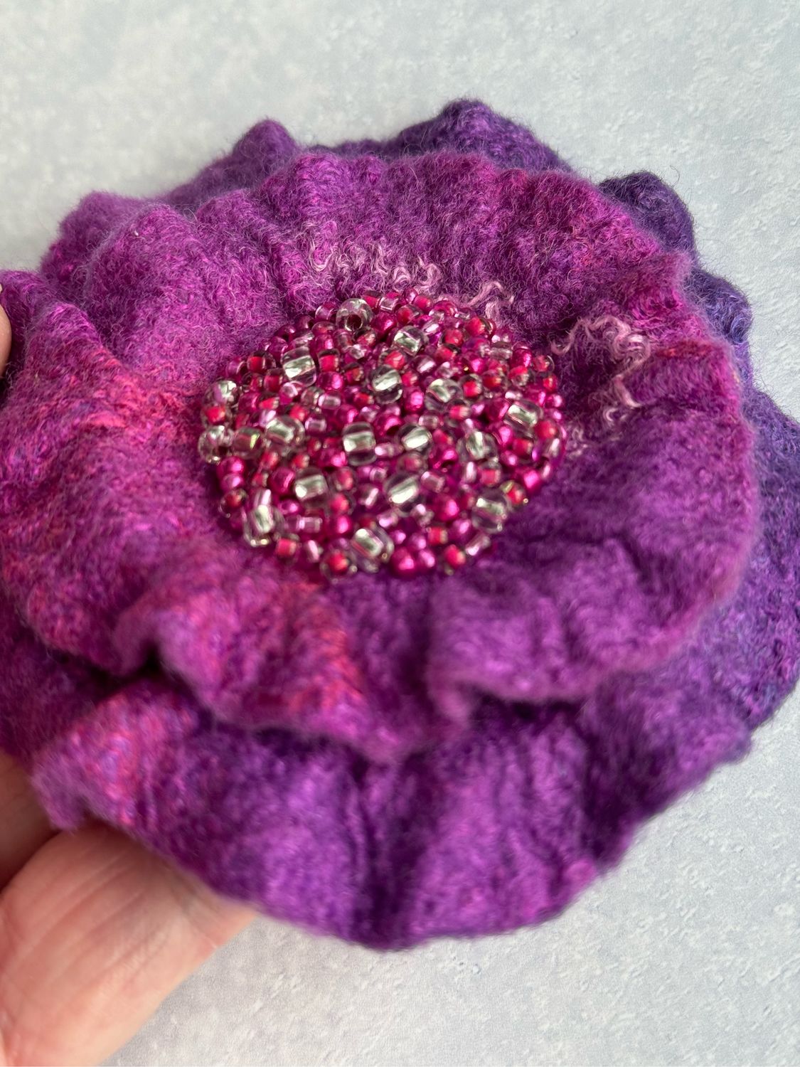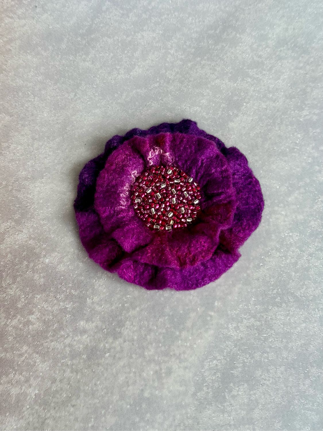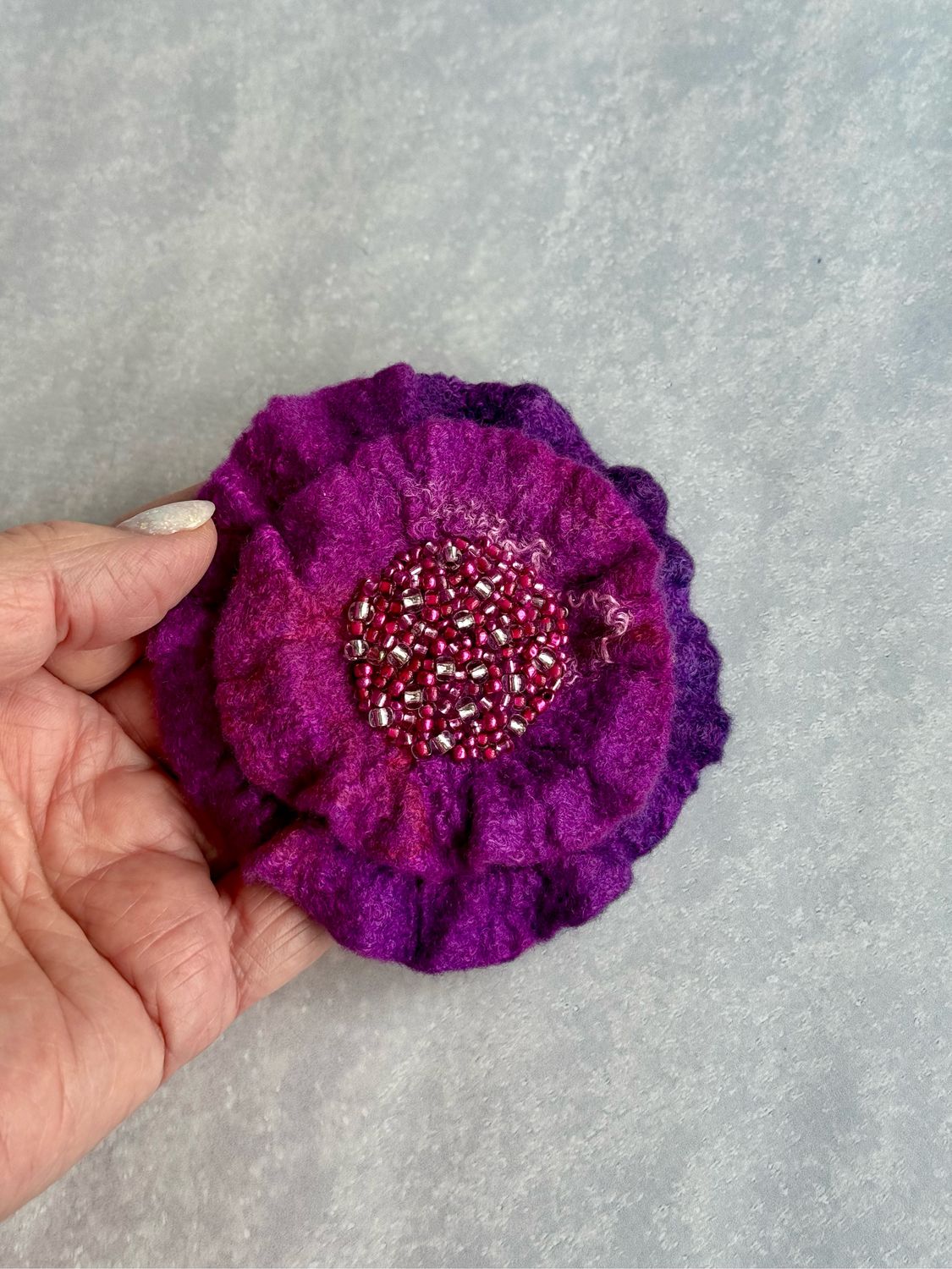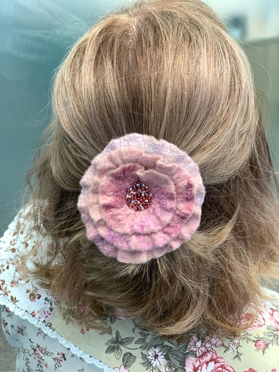 Украшение для волос в виде цветка. Сваляно из мериносовой шерсти, расшито бисером и бусинами.