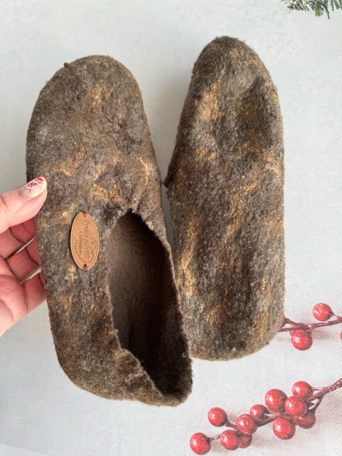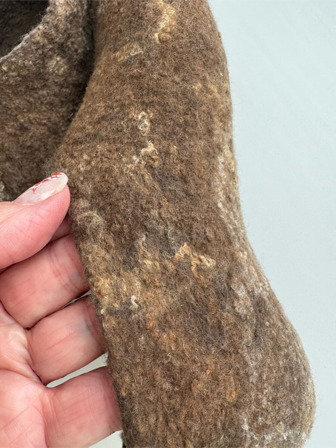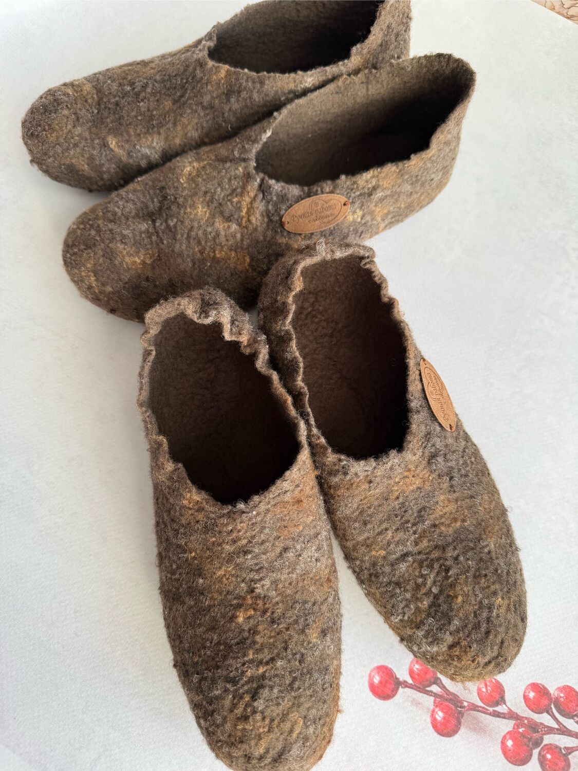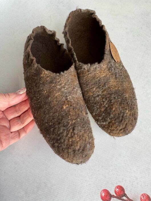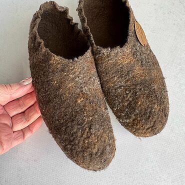 Валяю из тончайшей нежной шерсти, поэтому при активной носке, если по полу ходить, быстро протрутся.